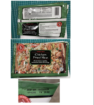 20-oz. (1 lb. 4 oz.) plastic bag packages containing frozen “TRADER JOE’S Chicken Fried Rice with stir fried rice, vegetables, seasoned dark chicken meat and eggs” with BEST BY dates 9/8/2026 through 11/17/2026.